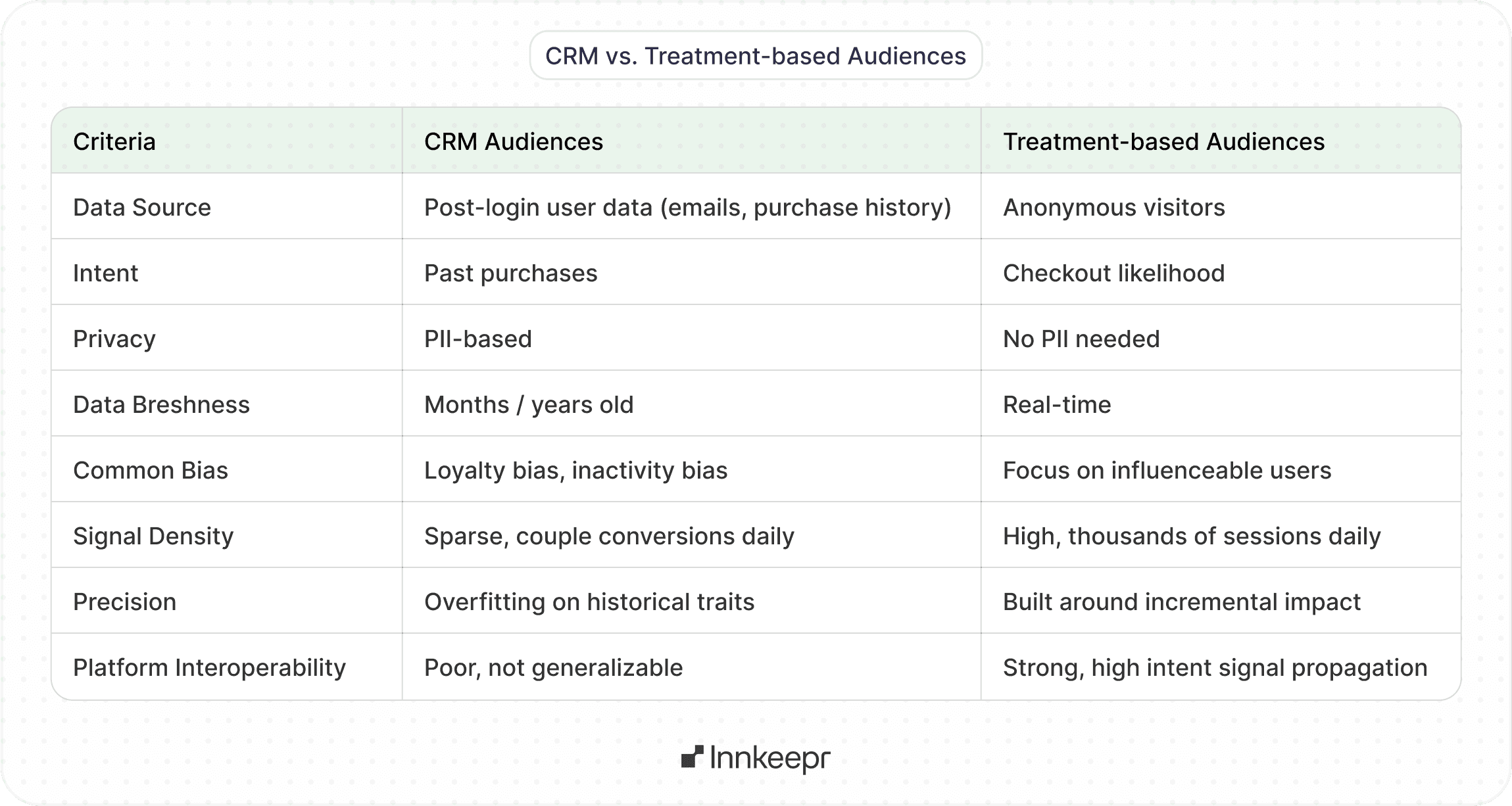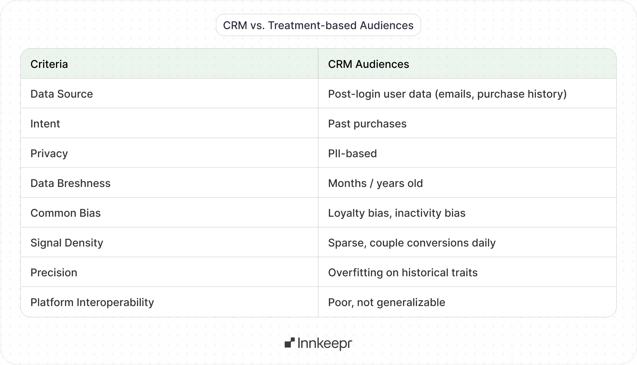 The following table outlines the key differences between CRM-based and treatment-based audience strategy.
